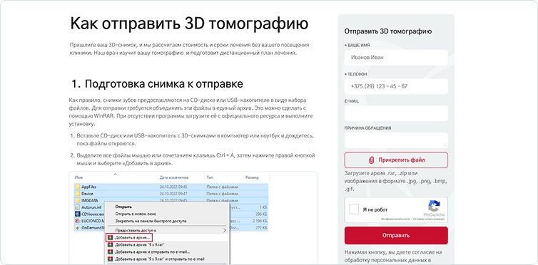 Как правило, снимки зубов предоставляются на CD-диске или USB-накопителе в виде набора файлов. Для отправки требуется объединить эти файлы в единый архив. Это можно сделать с помощью WinRAR. При отсутствии программы загрузите её с официального ресурса и выполните установку.
