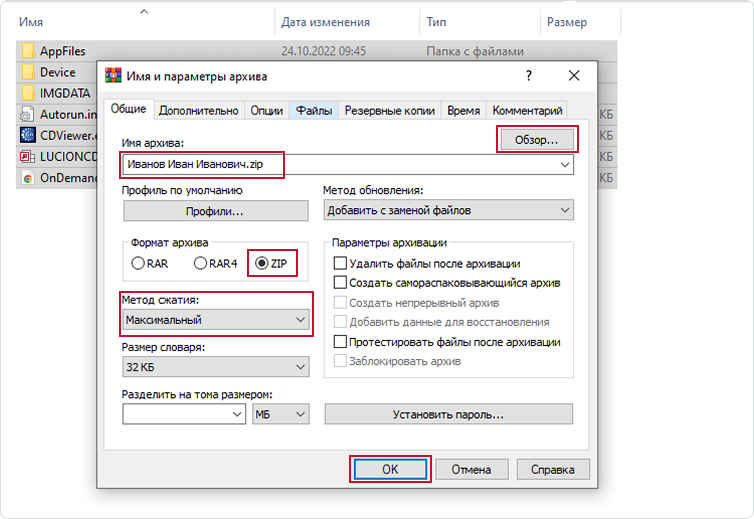 - выберите формат архива — ZIP (предпочтительно) или RAR;